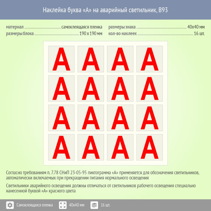 Наклейка буква «А» на аварийный светильник, B93 (пленка, 40х40 мм, блок 16 штук, 190х190 мм) в Кызыле купить