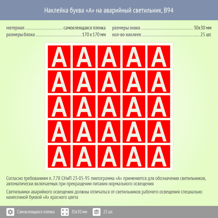 Наклейка буква «А» на аварийный светильник, B94 (пленка, 30х30 мм, блок 25 штук, 170х170 мм) в Кызыле купить