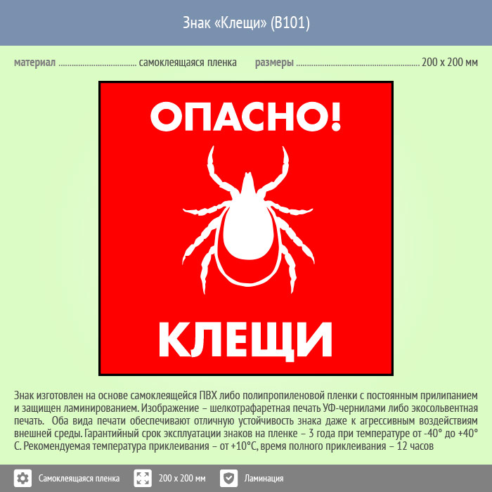 Знак «Опасно! Клещи», B101 (пленка c ламинированием, 200х200 мм) в Кызыле купить