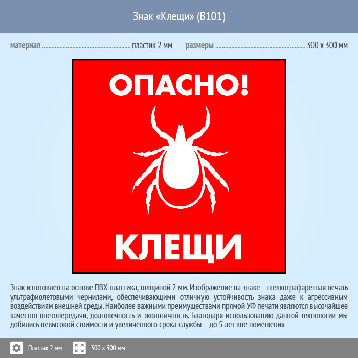 Знак «Опасно! Клещи», B101 (пластик, 300х300 мм) в Кызыле купить