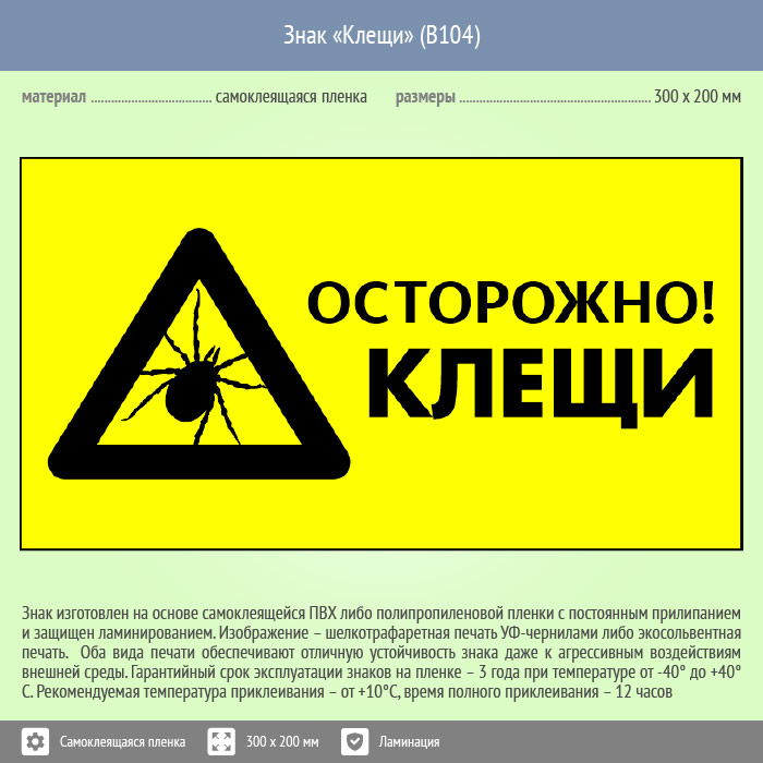 Знак «Осторожно! Клещи», B104 (пленка c ламинированием, 400х300 мм) в Кызыле купить