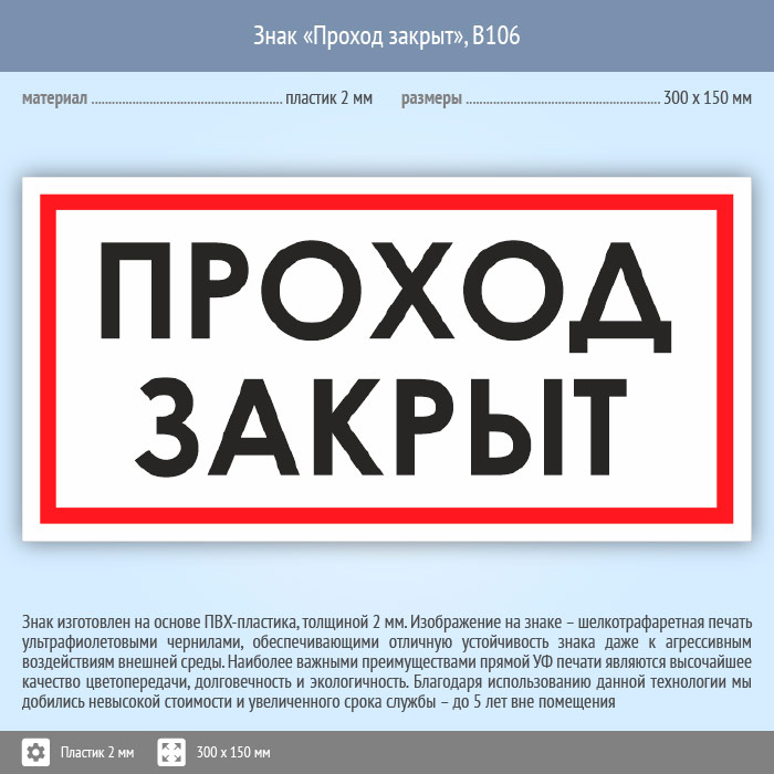 Знак «Проход закрыт», B106 (пластик, 300х150 мм) в Кызыле купить