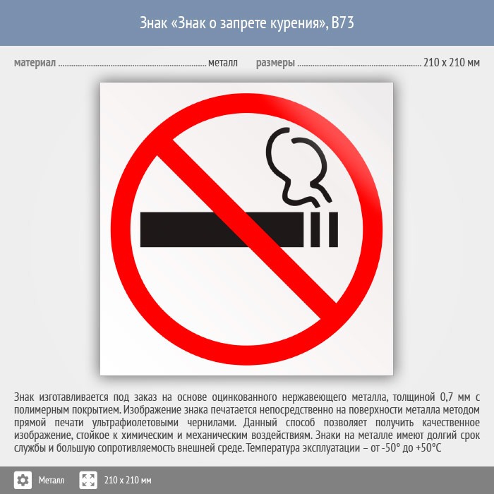 Знак «Знак о запрете курения», B73 (металл, 210х210 мм) в Кызыле купить