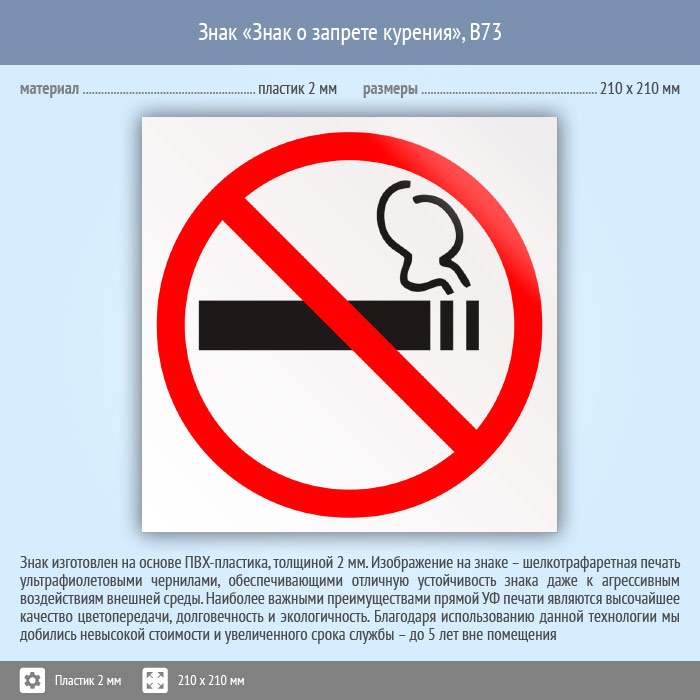 Знак «Знак о запрете курения», B73 (пластик, 210х210 мм) в Кызыле купить