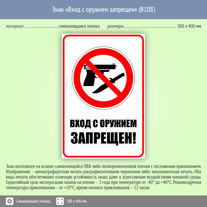 Знак «Вход с оружием запрещен», B108 (пленка, 300х400 мм) в Кызыле купить