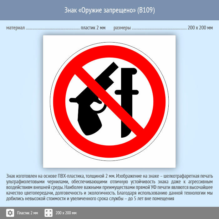 Знак «Оружие запрещено», B109 (пластик, 200х200 мм) в Кызыле купить