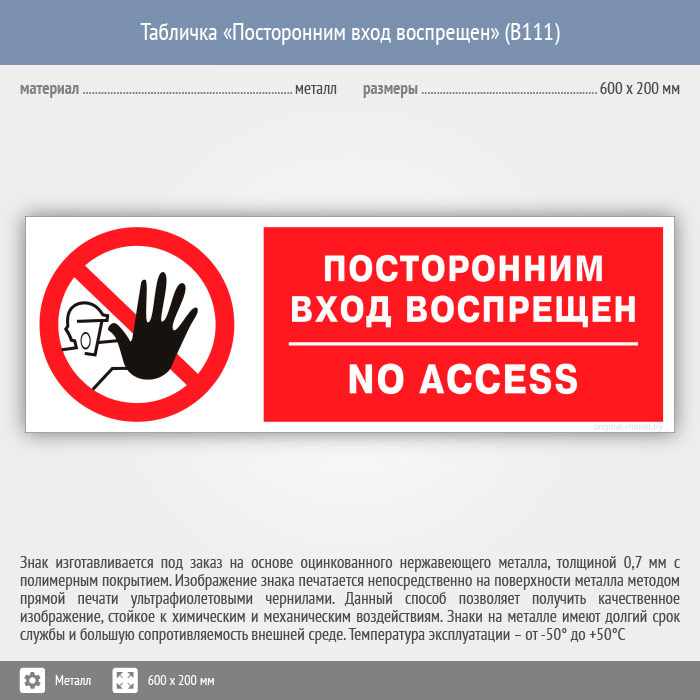 Табличка «Посторонним вход воспрещен», B111 (металл, 600х200 мм) в Кызыле купить