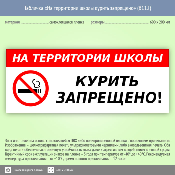 Табличка «На территории школы курить запрещено», B112 (пленка, 600х200 мм) в Кызыле купить