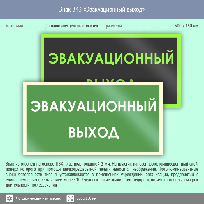 Знак B43 «Эвакуационный выход» (фотолюминесцентный пластик, 300х150 мм) в Кызыле купить