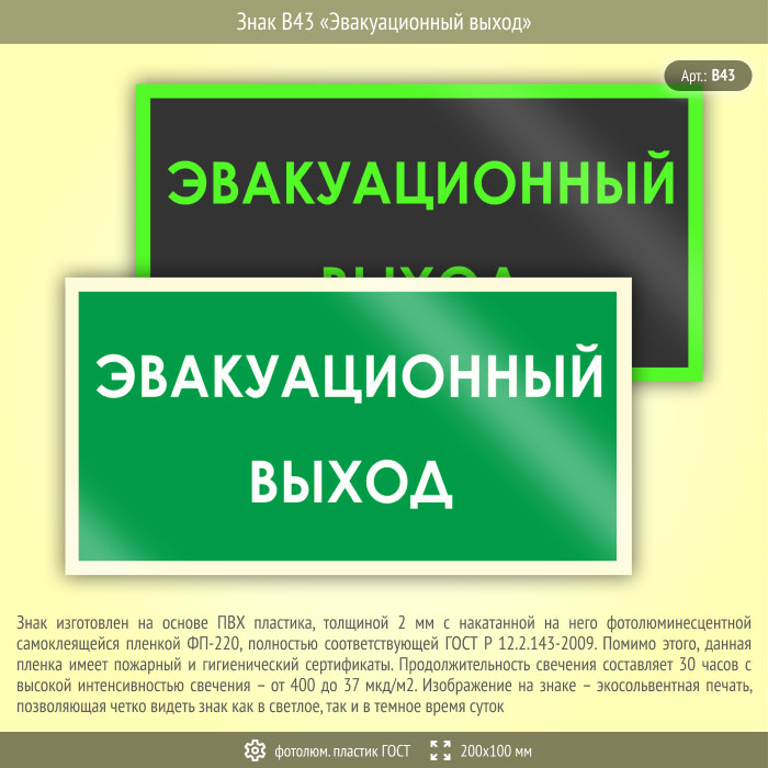 Знак B43 «Эвакуационный выход» (фотолюминесцентный пластик ГОСТ 34428-2018, 200х100 мм) в Кызыле купить
