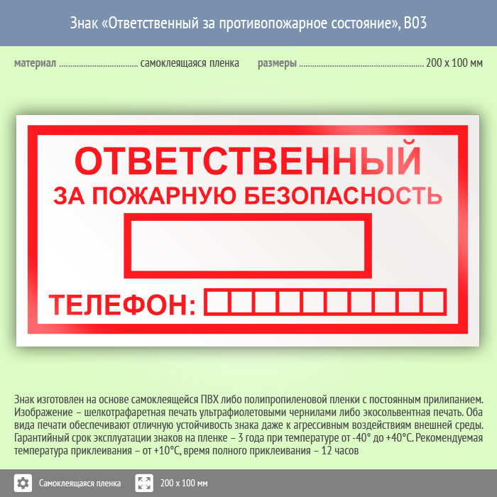 Знак «Ответственный за пожарную безопасность», B03 (пленка, 200х100 мм) в Кызыле купить