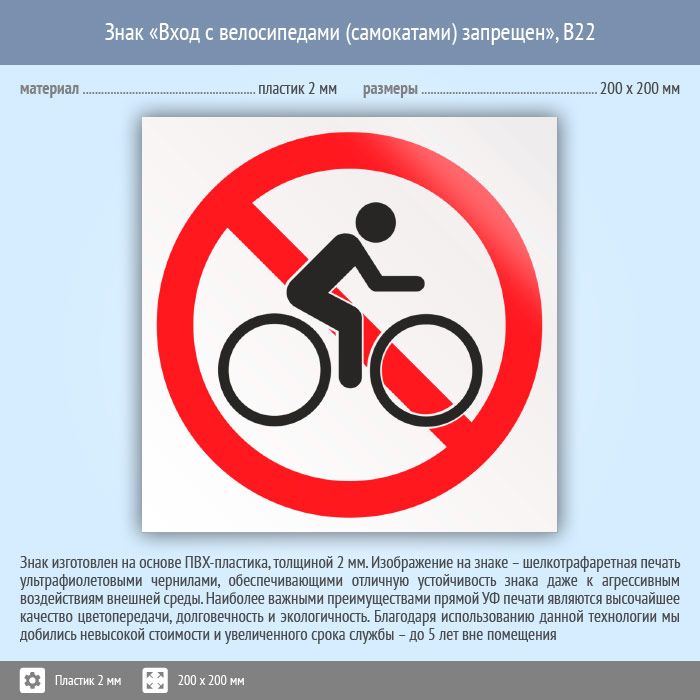 Знак «Вход с велосипедами (самокатами) запрещен», B22 (пластик, 200х200 мм) в Кызыле купить