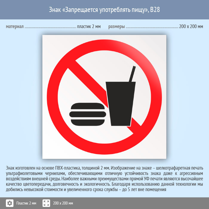 Знак «Запрещается употреблять пищу», B28 (пластик, 200х200 мм) в Кызыле купить