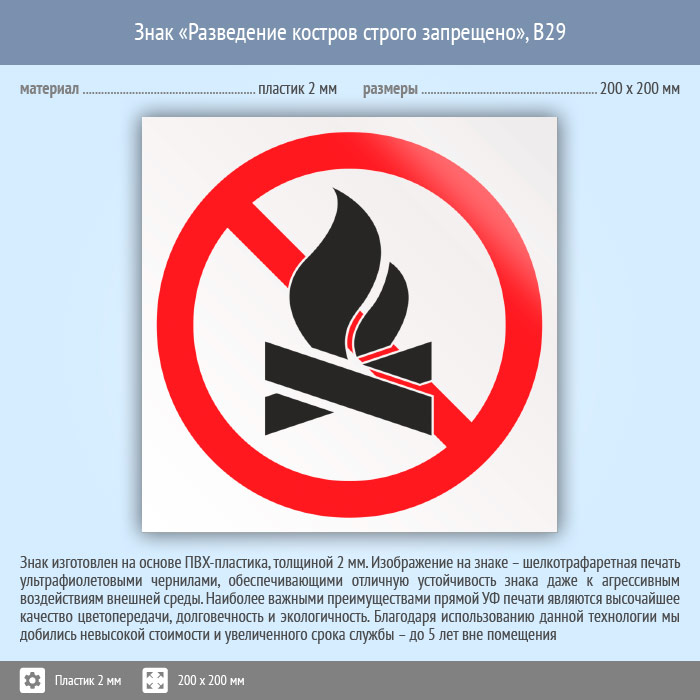 Знак «Разведение костров строго запрещено», B29 (пластик, 200х200 мм) в Кызыле купить