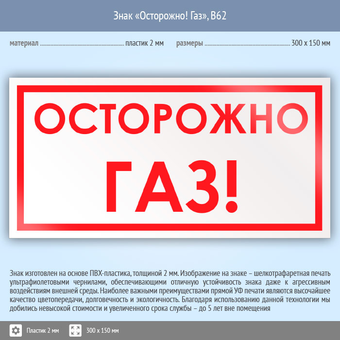 Знак «Осторожно! Газ», B62 (пластик, 300х150 мм) в Кызыле купить
