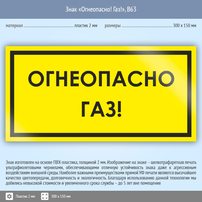 Знак «Огнеопасно! Газ!», B63 (пластик, 300х150 мм) в Кызыле купить