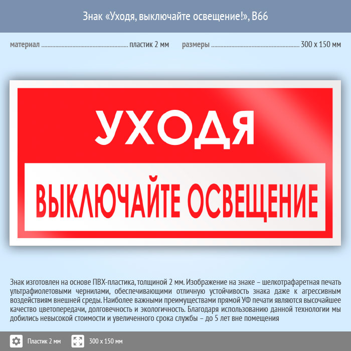 Знак «Уходя, выключайте освещение!», B66 (пластик, 300х150 мм) в Кызыле купить