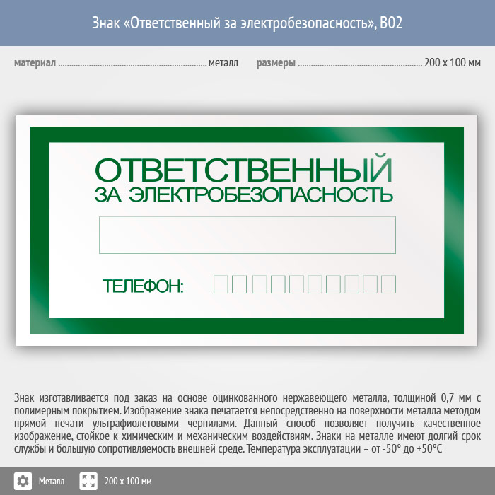 Знак «Ответственный за электробезопасность», B02 (металл, 200х100 мм) в Кызыле купить