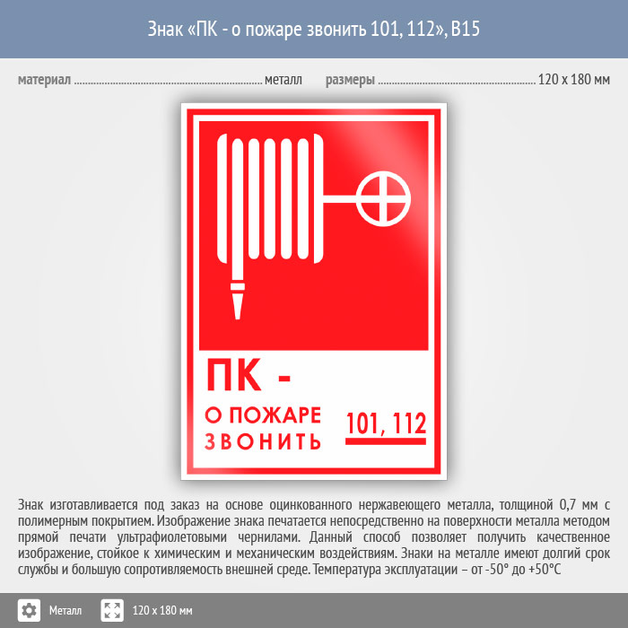 Знак «ПК - о пожаре звонить 101, 112», B15 (металл, 120х180 мм) в Кызыле купить