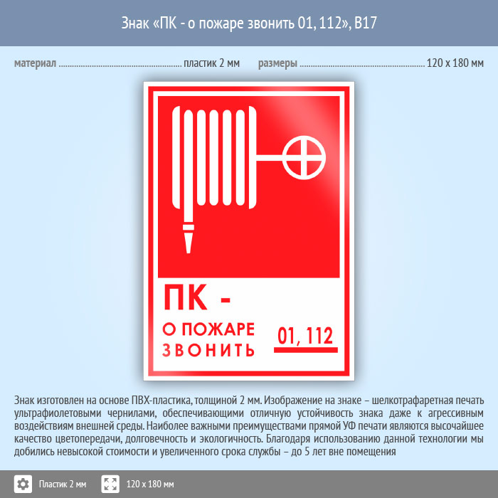 Знак «ПК - о пожаре звонить 01, 112», B17 (пластик, 120х180 мм) в Кызыле купить