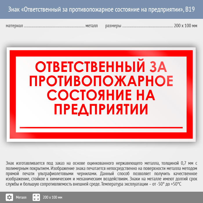 Знак «Ответственный за противопожарное состояние на предприятии», B19 (металл, 200х100 мм) в Кызыле купить