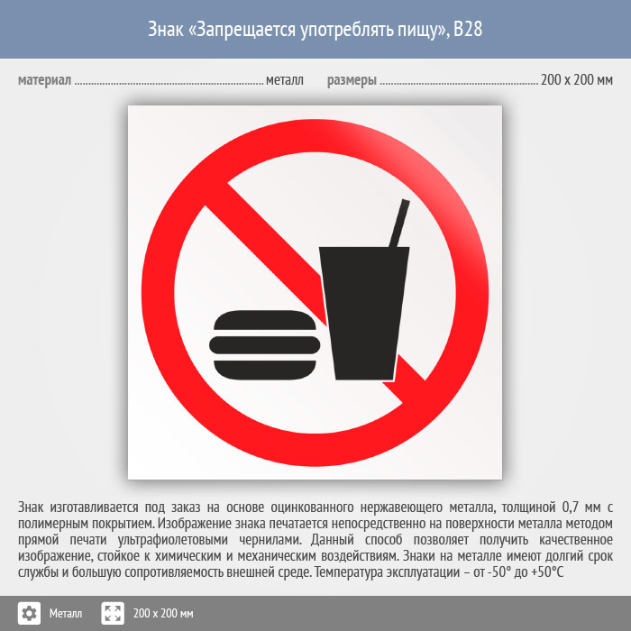 Знак «Запрещается употреблять пищу», B28 (металл, 200х200 мм) в Кызыле купить