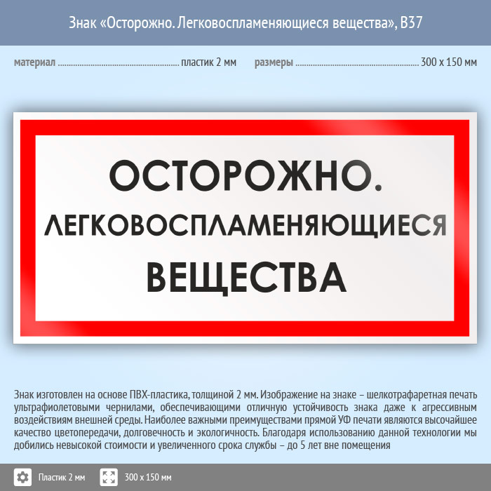 Знак «Осторожно. Легковоспламеняющиеся вещества», B37 (пластик, 300х150 мм) в Кызыле купить