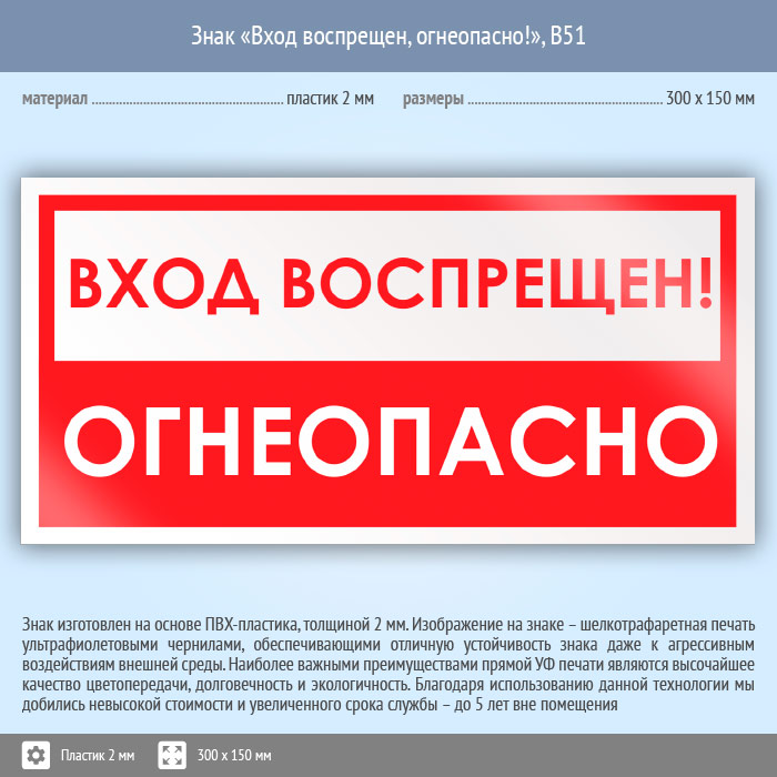 Знак «Вход воспрещен, огнеопасно!», B51 (пластик, 300х150 мм) в Кызыле купить