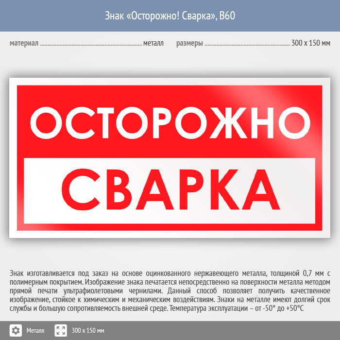 Знак «Осторожно! Сварка», B60 (металл, 300х150 мм) в Кызыле купить
