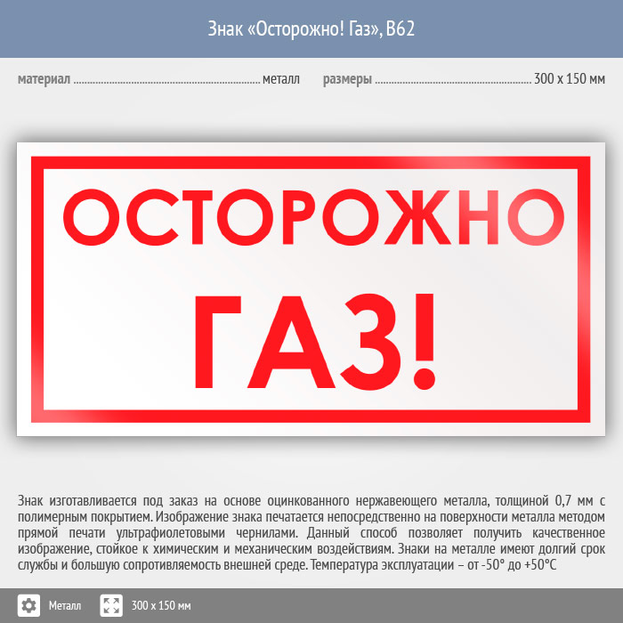 Знак «Осторожно! Газ», B62 (металл, 300х150 мм) в Кызыле купить