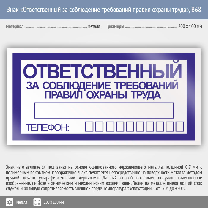 Знак «Ответственный за соблюдение требований правил охраны труда», B68 (металл, 200х100 мм) в Кызыле купить