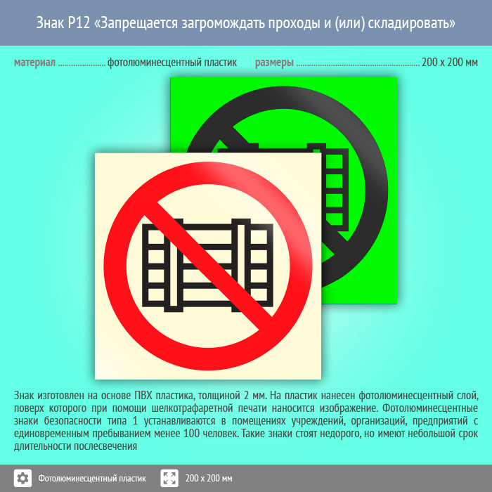 Знак P12 «Запрещается загромождать проходы и (или) складировать» (фотолюминесцентный пластик, 200х200 мм) в Кызыле купить