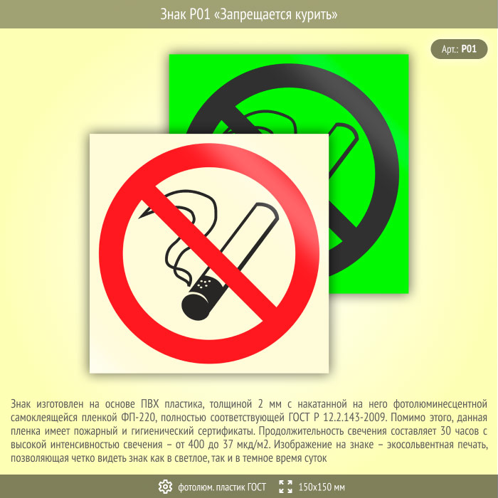 Знак P01 «Запрещается курить» (фотолюминесцентный пластик ГОСТ 34428-2018, 150х150 мм) в Кызыле купить