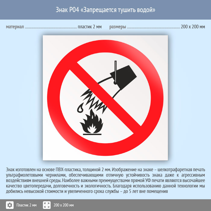 Знак P04 «Запрещается тушить водой» (пластик, 200х200 мм) в Кызыле купить