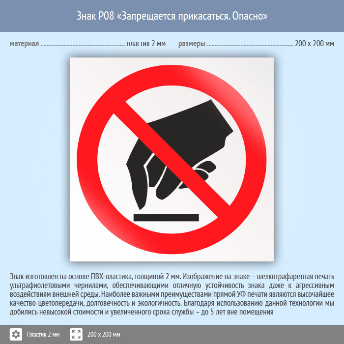 Знак P08 «Запрещается прикасаться. Опасно» (пластик, 200х200 мм) в Кызыле купить