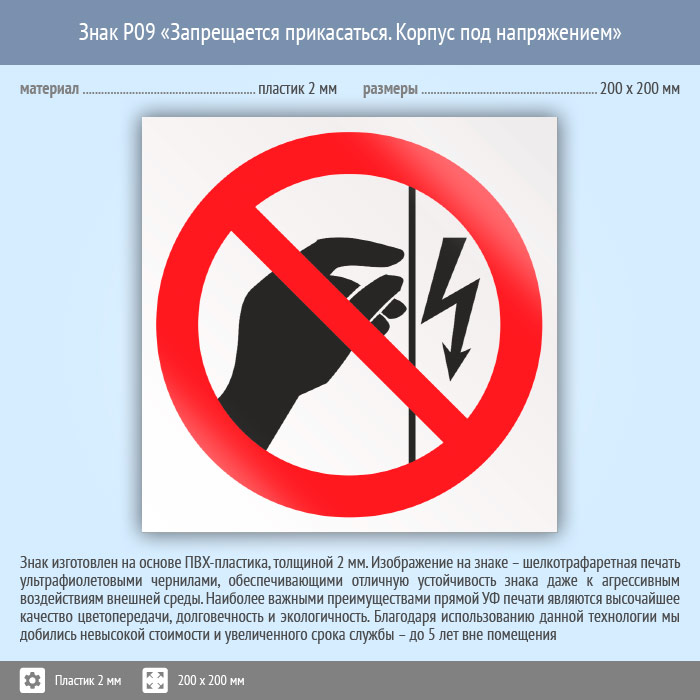 Знак P09 «Запрещается прикасаться. Корпус под напряжением» (пластик, 200х200 мм) в Кызыле купить