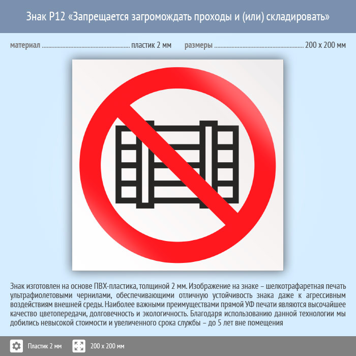 Знак P12 «Запрещается загромождать проходы и (или) складировать» (пластик, 200х200 мм) в Кызыле купить