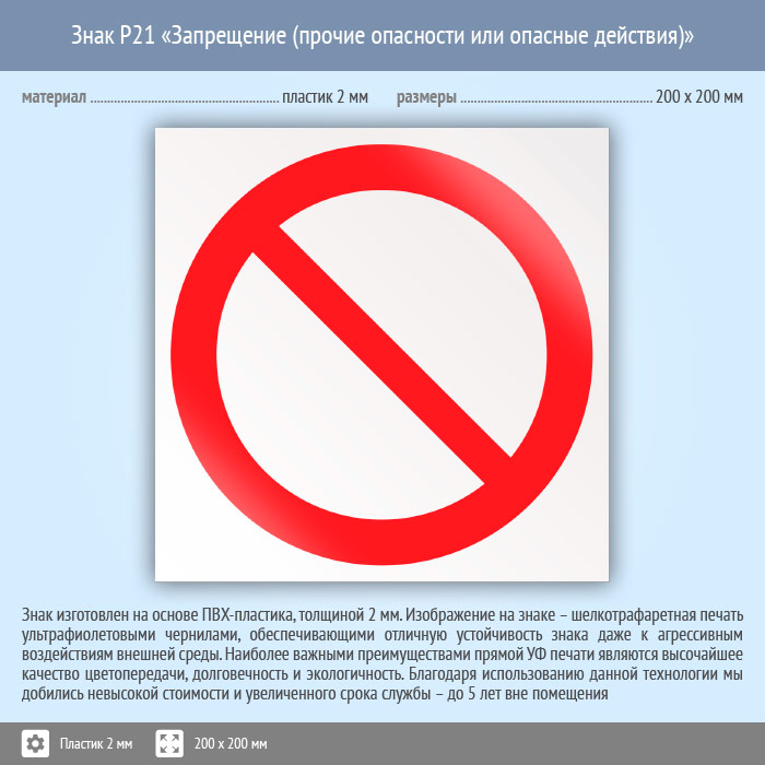 Знак P21 «запрещение (прочие опасности или опасные действия)» (пластик, 200х200 мм) в Кызыле купить