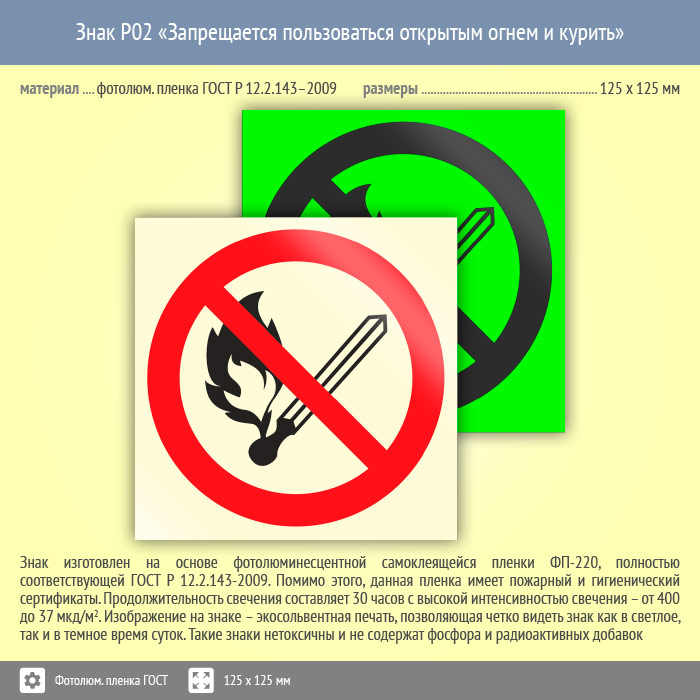 Знак P02 «Запрещается пользоваться открытым огнем и курить» (фотолюминесцентная пленка ГОСТ 34428-2018, 125х125 мм) в Кызыле купить