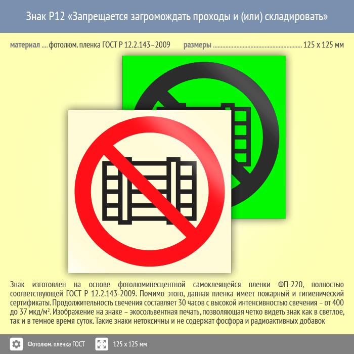 Знак P12 «Запрещается загромождать проходы и (или) складировать» (фотолюминесцентная пленка ГОСТ 34428-2018, 125х125 мм) в Кызыле купить