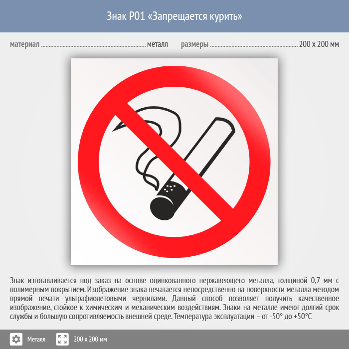 Знак P01 «Запрещается курить» (металл, 200х200 мм) в Кызыле купить