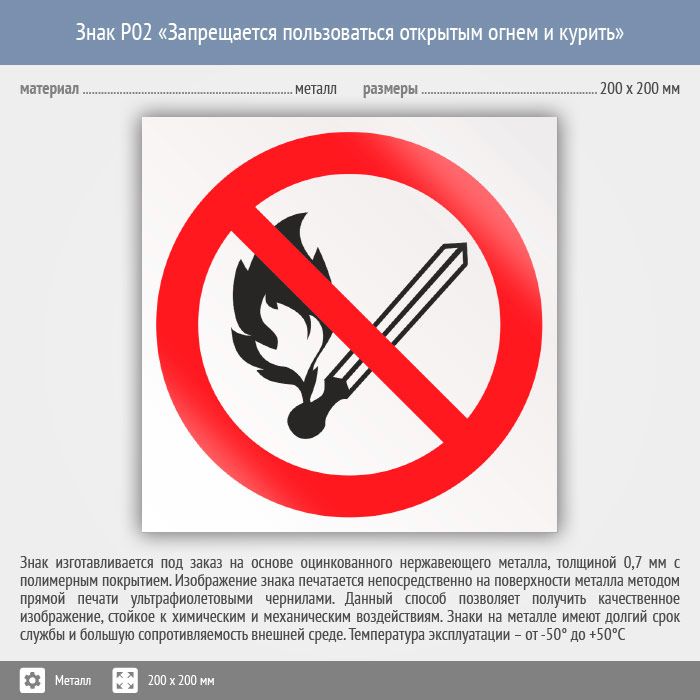 Знак P02 «Запрещается пользоваться открытым огнем и курить» (металл, 200х200 мм) в Кызыле купить