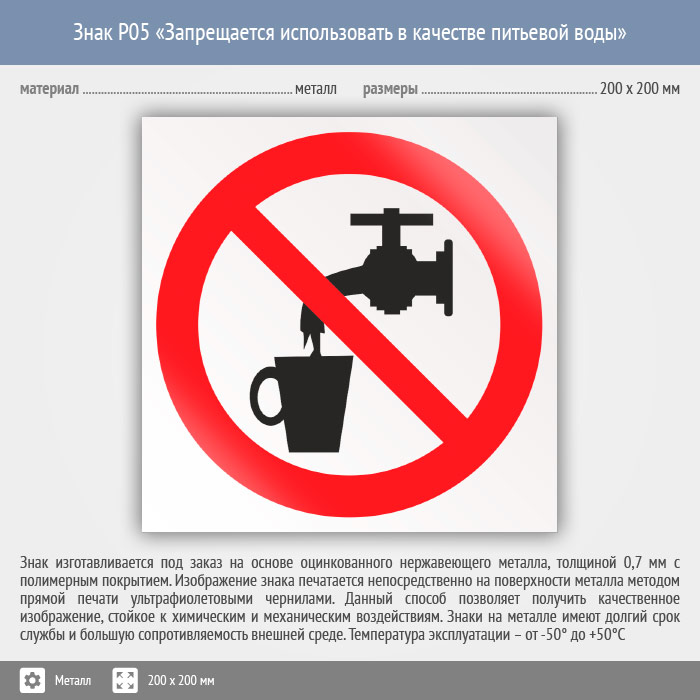 Знак P05 «Запрещается использовать в качестве питьевой воды» (металл, 200х200 мм) в Кызыле купить
