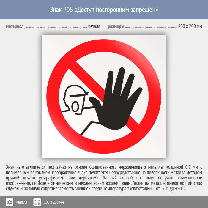 Знак P06 «Доступ посторонним запрещен» (металл, 200х200 мм) в Кызыле купить