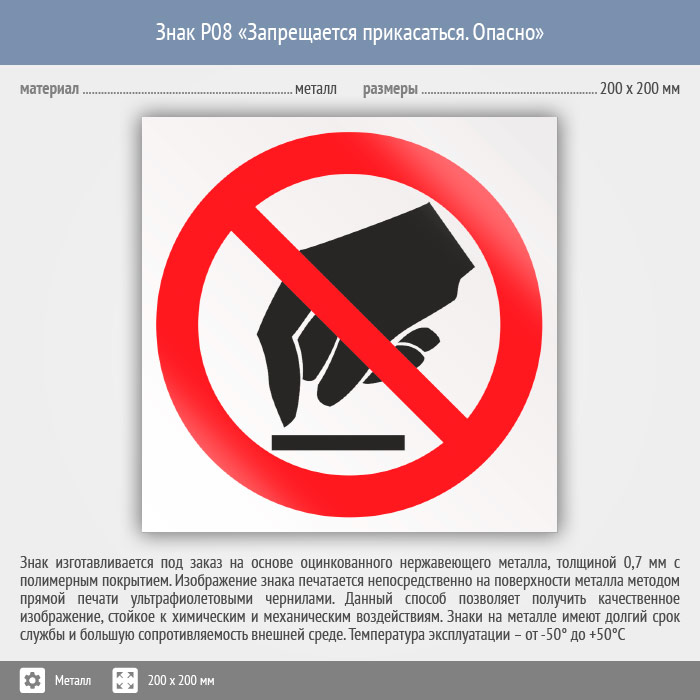 Знак P08 «Запрещается прикасаться. Опасно» (металл, 200х200 мм) в Кызыле купить
