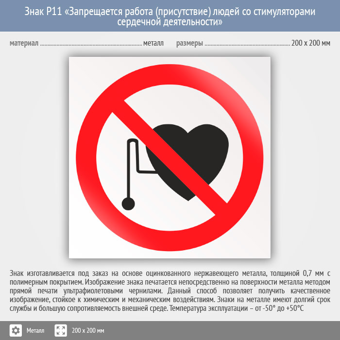 Знак P11 «Запрещается работа (присутствие) людей со стимуляторами сердечной деятельности» (металл, 200х200 мм) в Кызыле купить