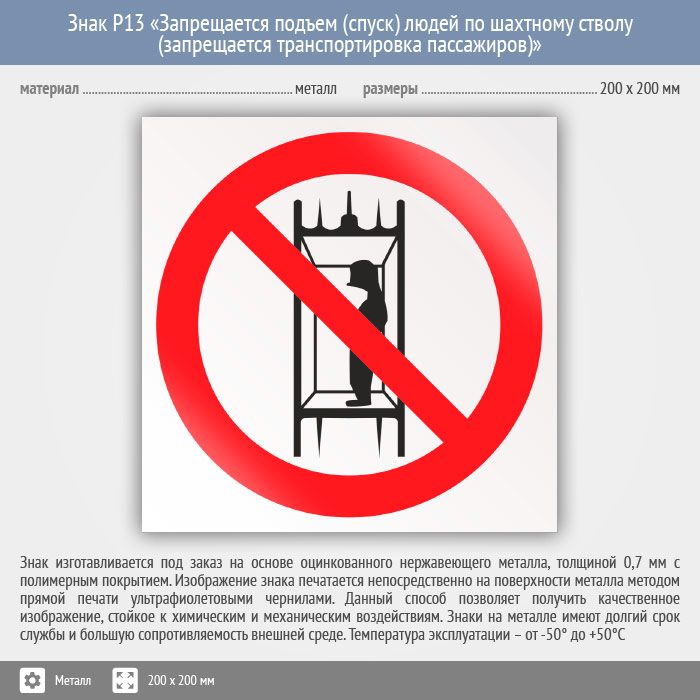 Знак P13 «Запрещается подъем (спуск) людей по шахтному стволу (Запрещается транспортировка пассажиров)» (металл, 200х200 мм) в Кызыле купить