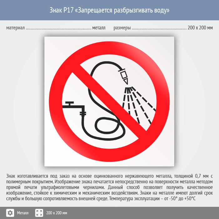 Знак P17 «Запрещается разбрызгивать воду» (металл, 200х200 мм) в Кызыле купить