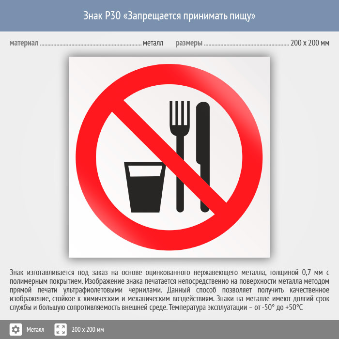 Знак P30 «Запрещается принимать пищу» (металл, 200х200 мм) в Кызыле купить