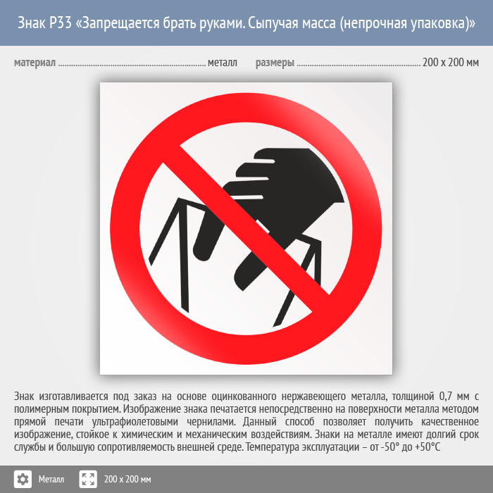Знак P33 «Запрещается брать руками. Сыпучая масса (непрочная упаковка)» (металл, 200х200 мм) в Кызыле купить